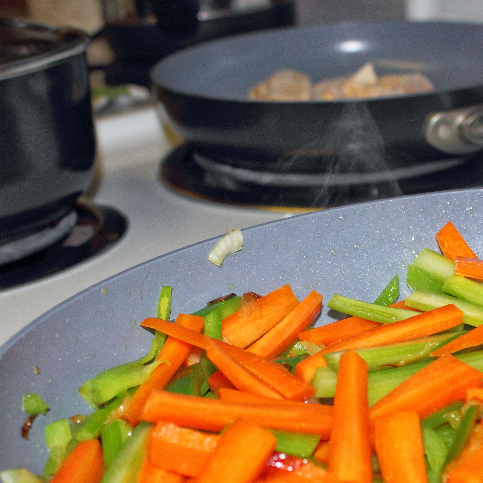 | See the veggies, chicken, and rice, all living harmoniously on one stove? |