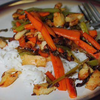 You need: veggies (whatever you like - I use white onion, carrots, celery and green pepper), chicken (or tofu or another meat or you can take the protein out, I am flexible with what you decide to make for yourself), rice and about two table spoons of oil (I love this recipe with peanut oil but we didn't have it so we used regular olive oil).